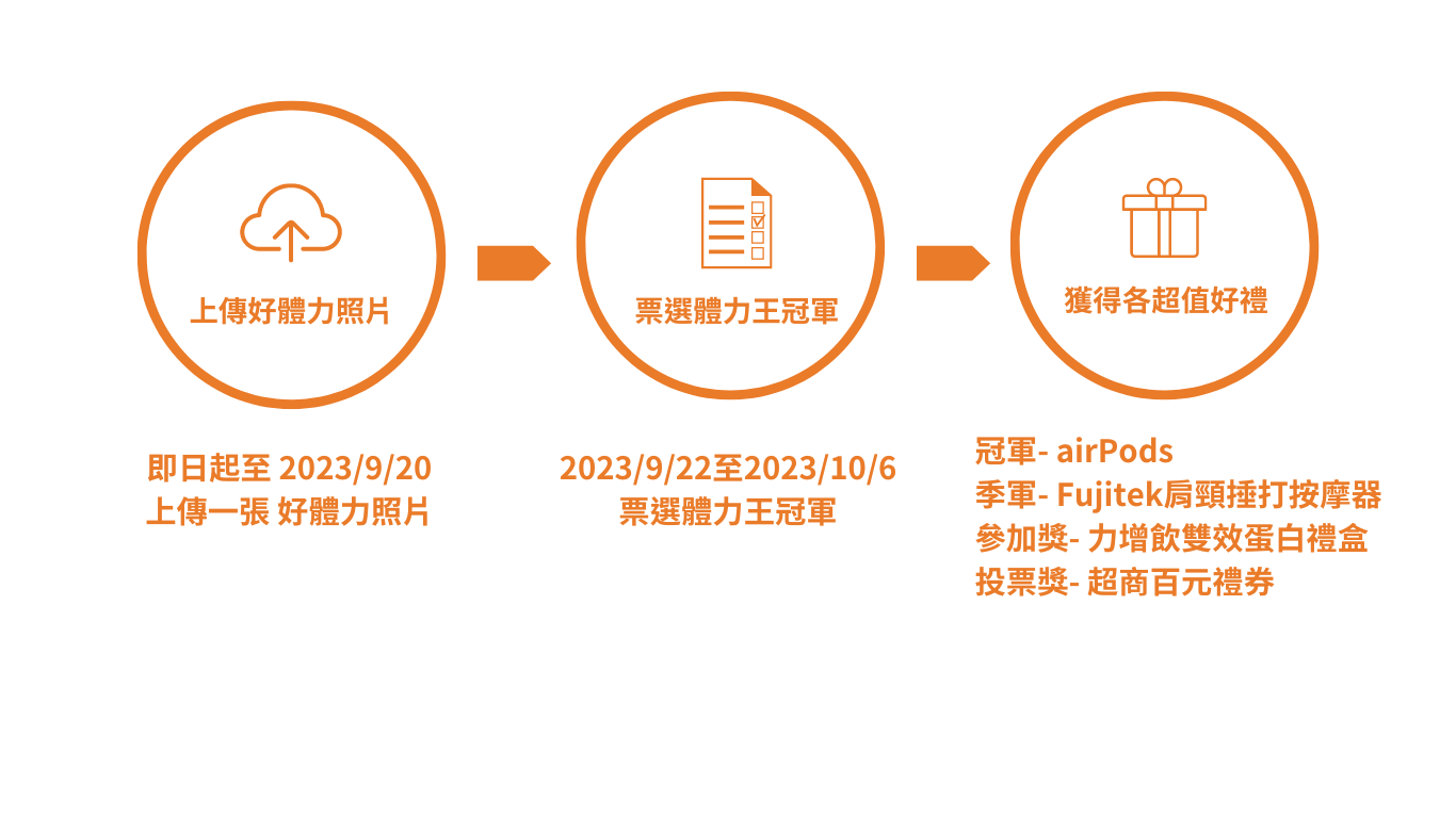 3、體力王冠軍可獲得Airpods(價值$5990)乙個,亞軍可獲得Fujitek(價值$3990)肩頸捶打按摩器乙個!